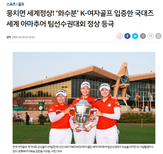 아마추어 세계랭킹 4위이자 항저우 아시안게임 단체전 은메달리스트인 김민솔을 필두로 서교림(이상 17) 이효송(마산제일여중 15)으로 꾸린 여자 국가대표팀은 29일(한국시간) 아랍에미레이트(UAE) 아부다비골프클럽(파72)에서 막을 내린 세계아마추어 팀선수권대회 단체전에서 22언더파 554타를 합작해 정상에 올랐다.